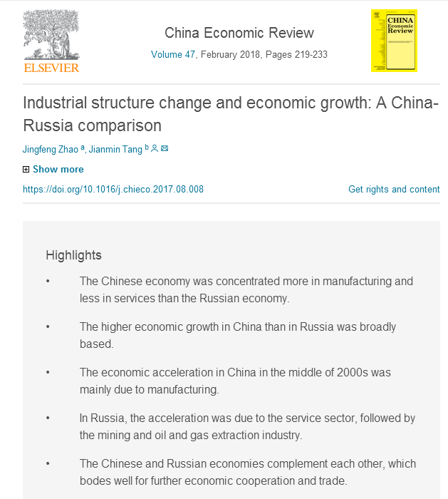 近日,太阳官网世界经济与贸易系赵景峰教授和加拿大工业部高级研究员Jianmin Tang先生的合著论文“Industrial Structure Change and Economic Growth: A China-Russia Comparison”发表在研究中国问题的知名SSCI检索期刊《China Economic Review》,Volume 47, February 2018, Pages 219-233,China Economic Review近五年综合影响因子为2.008。